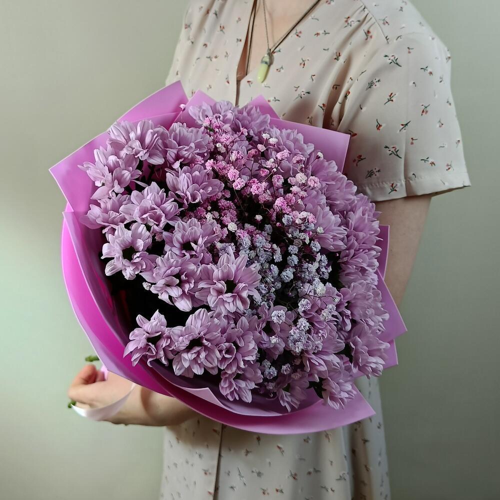 Букет из 5 розовых кустовых хризантем и гипосфилы