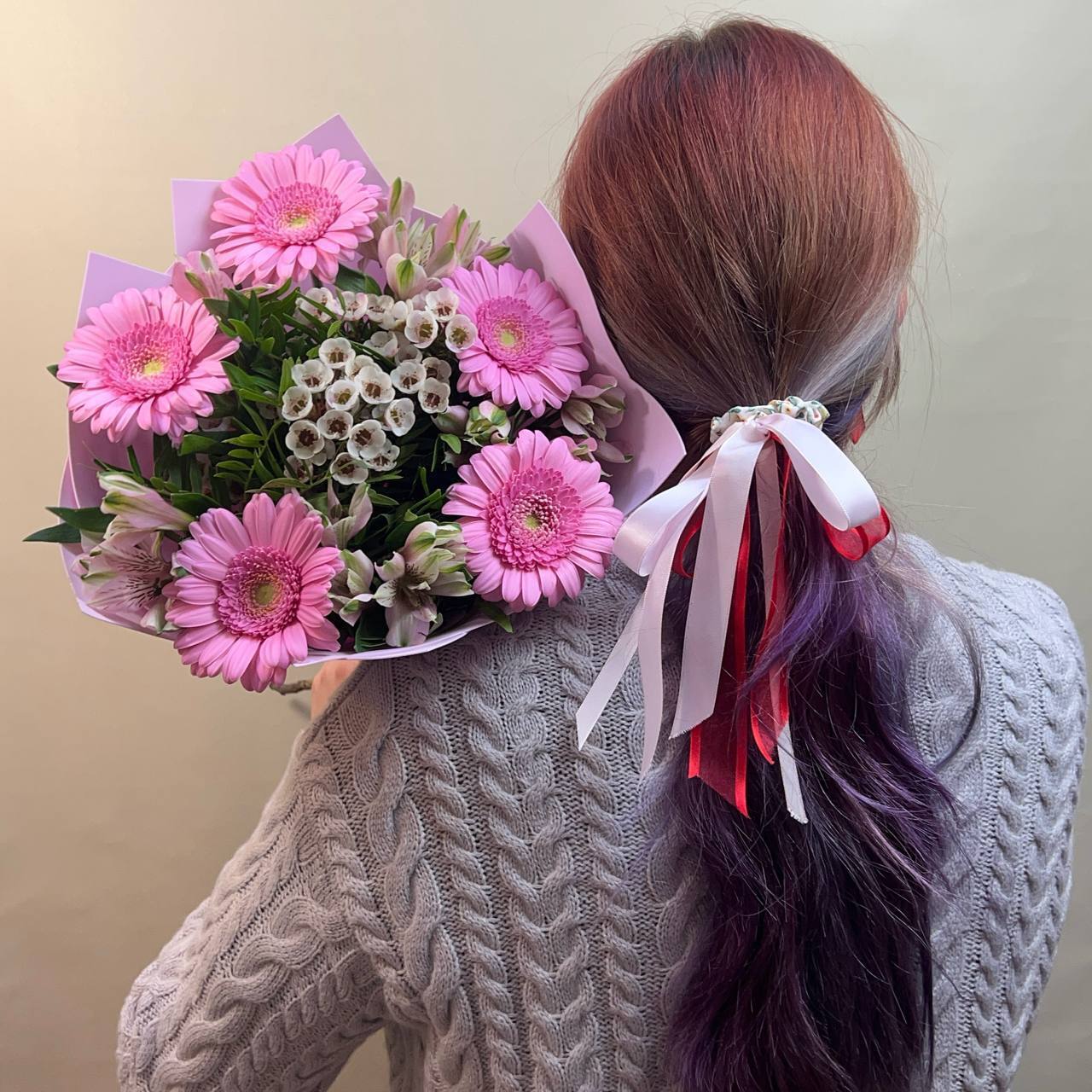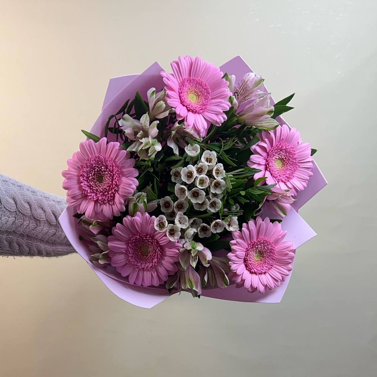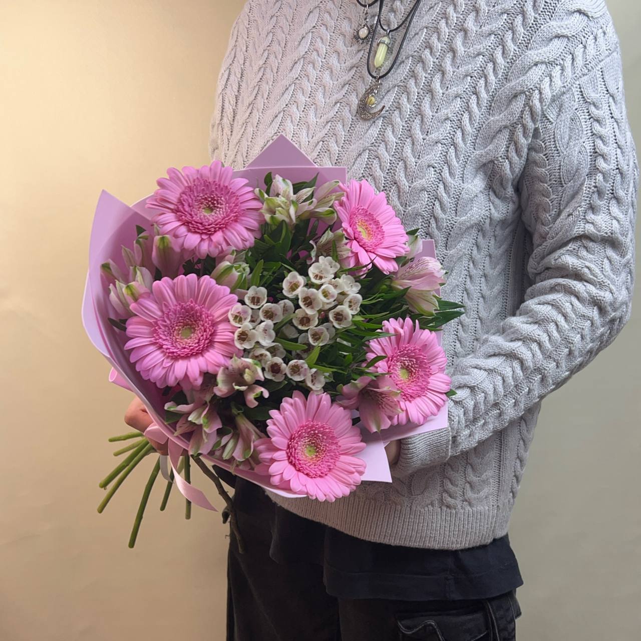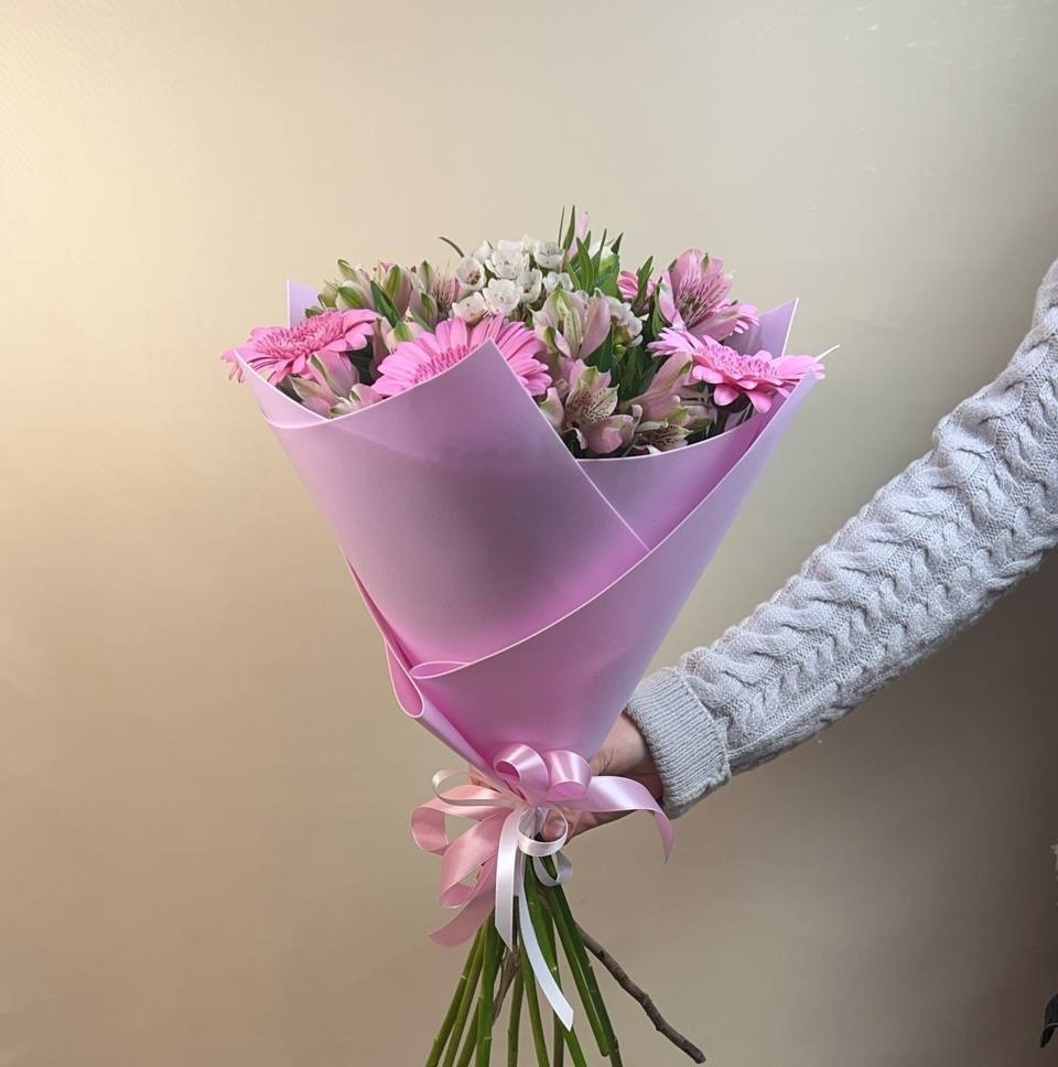 Нежны букет из хамелациума, альстромерий и розовыми герберами с зеленью, прекрасный подарок для мамы, девушки, подруги, коллеги. Хороший букет на 1 сентября, ребенку, в школу, для учителя. Цветы с доставкой по Люберцам и Москве.