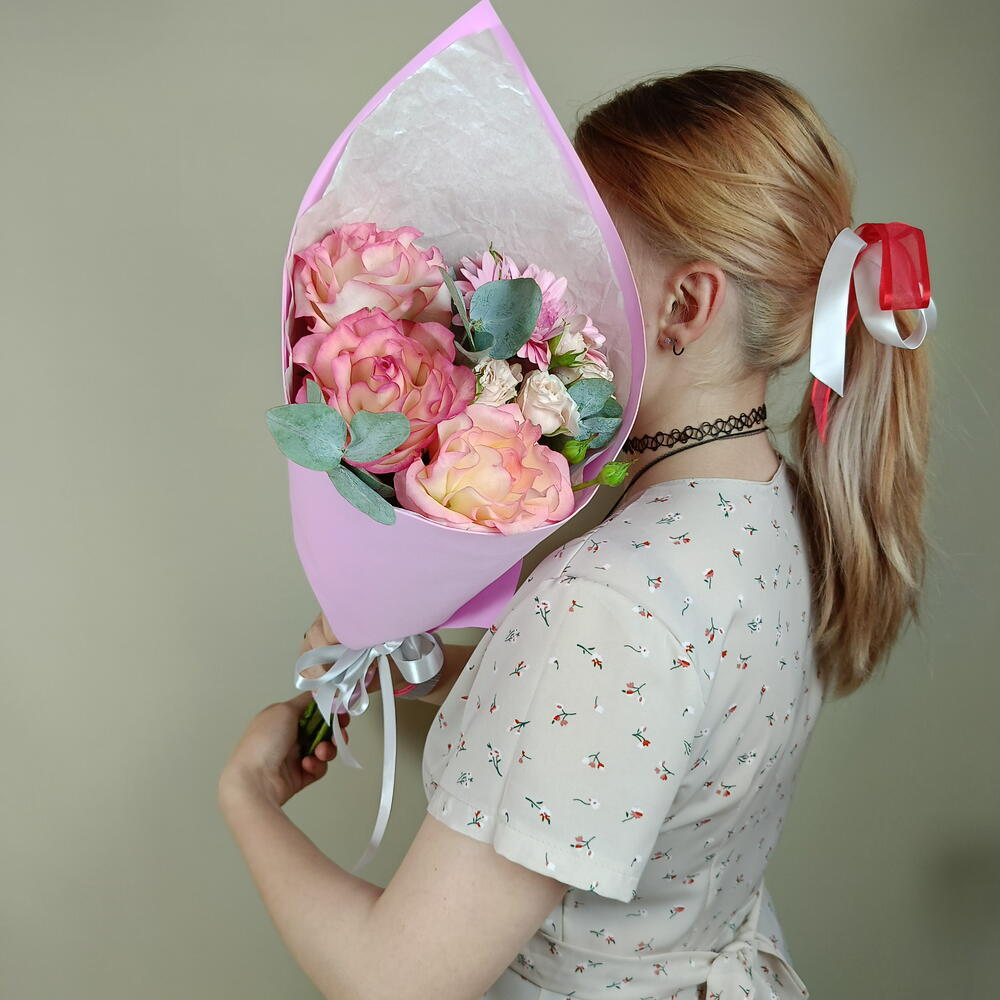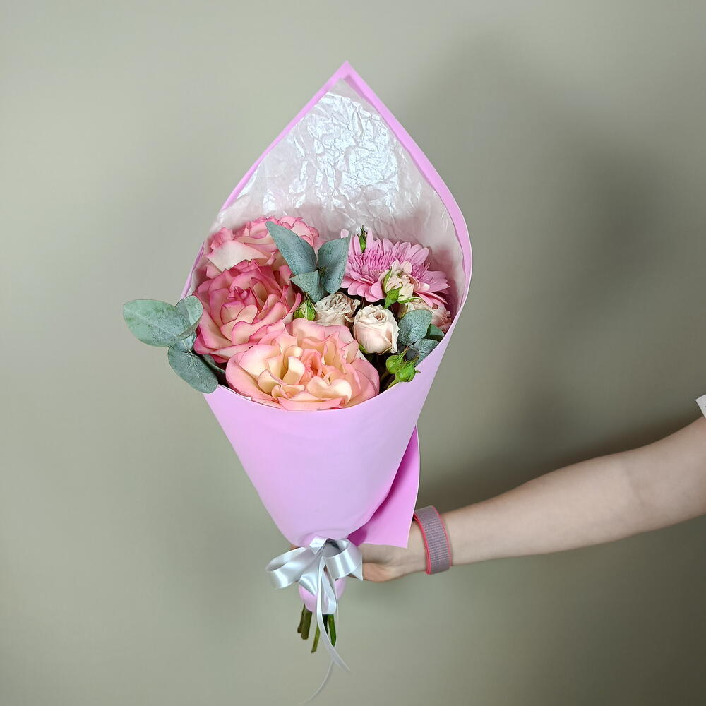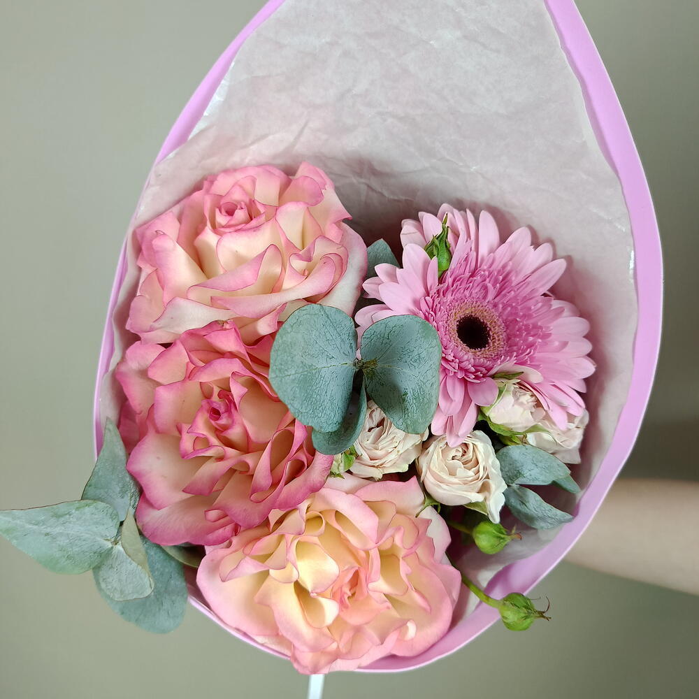 Нежный букет из французских роз эвкалипта герберы и кустовой розы в упаковке